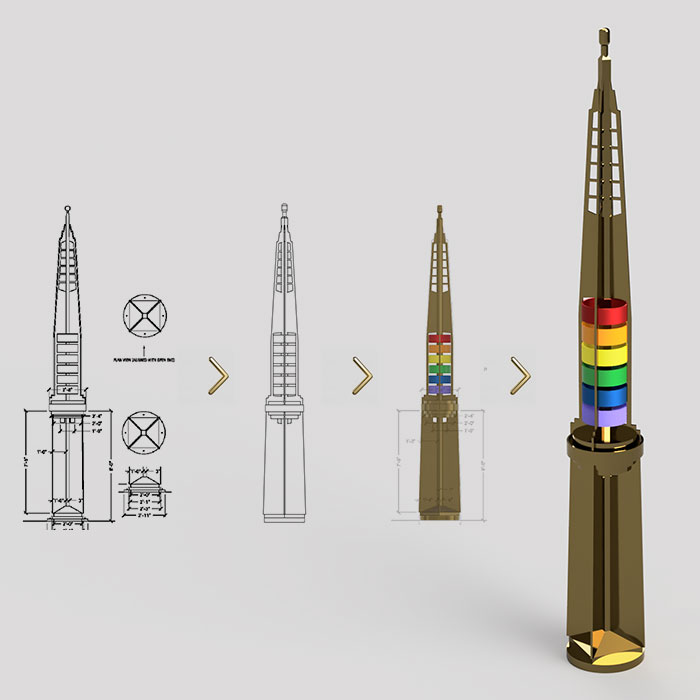 The Legacy Project, a Chicago non-profit that created the 25 foot tall pillars on the sidewalks of the Lakeview neighborhood, wanted mini versions of their pillars to use as table centerpieces for their fundraising gala. We started with very rough blueprints and created a 3D model. Next we iterated through prototypes to come up with a plan for how to assemble the pieces and streamline the production process. And finally, we printed, painted, and assembled 40 pillars, each 18" tall.